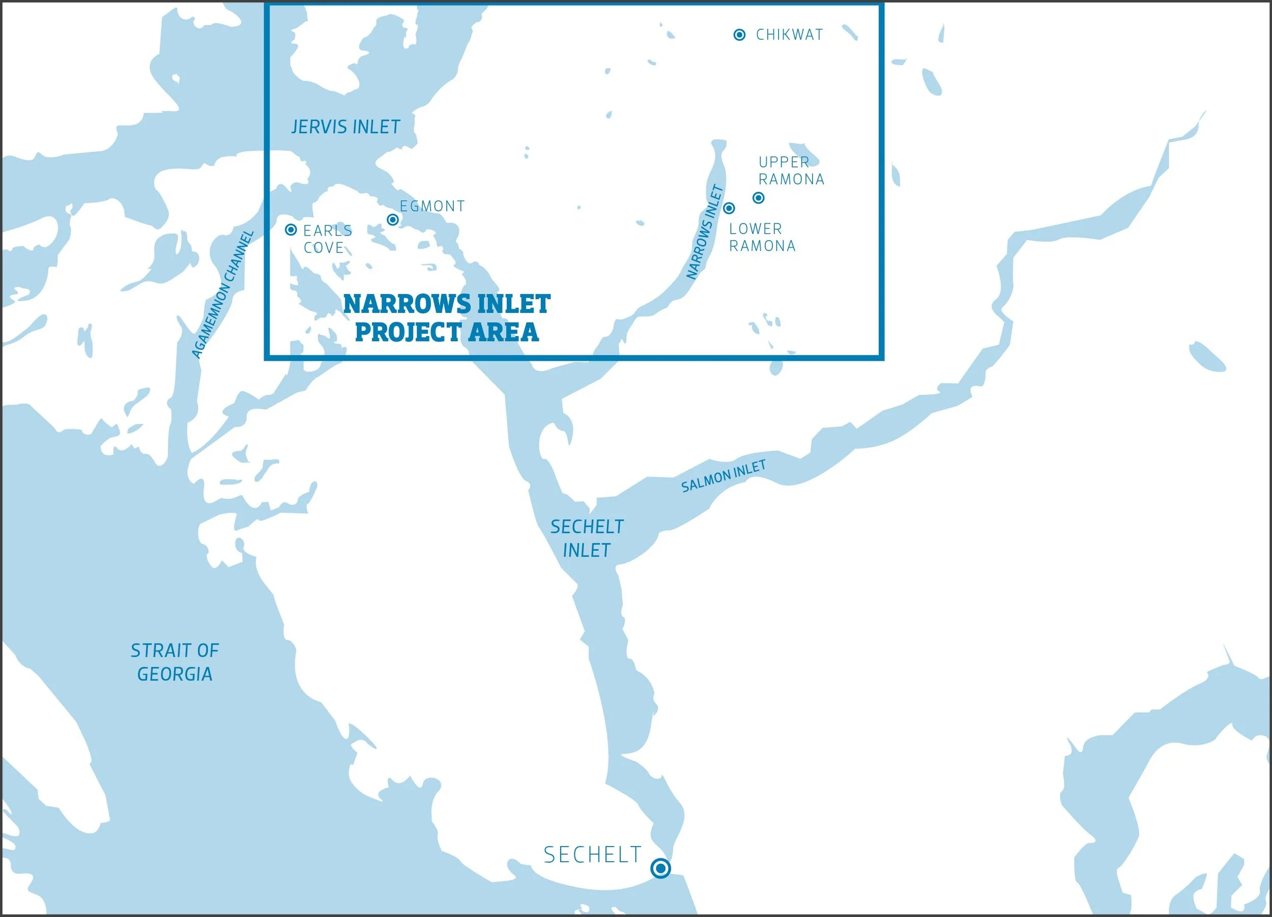 Located on Chickwat Creek and Upper and Lower Ramona Creeks, 75 kilometers northwest of Vancouver and 50 kilometers north of Sechelt, the Narrows Inlet Project is an energy initiative consisting of three small-hydro generating stations intending to create up to 33 megawatts of clean renewable energy The project will also consist of interconnecting transmission lines to connect to the BC transmission power line. The construction process has already started, with an expected completion date of November 2017.